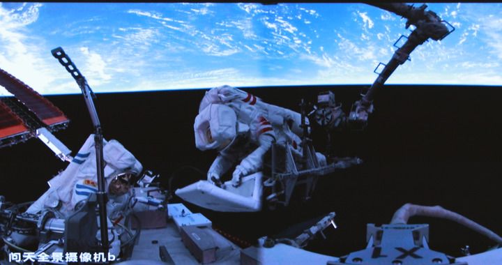 这是2025年6月26日在北京航天飞行控制中心屏幕上拍摄的神舟二十号航天员陈冬(左)与陈中瑞在空间站组合体舱外工作的画面。